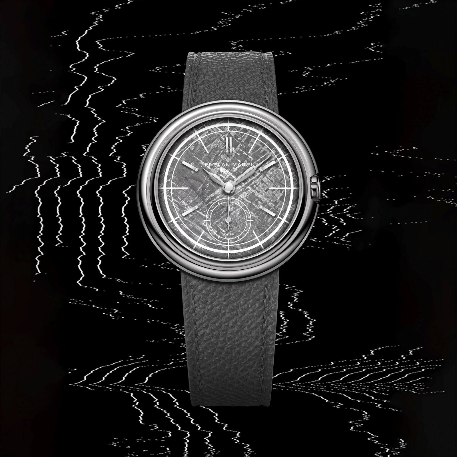 إعادة تصور معاصرة لساعة "ديسكو فولانتي" من فيرلان ماري، هذه النسخة الفريدة، التي تم إنشاؤها خصيصاً لمزاد AREA 51، تمثل لقاء حقيقي بين الماضي والمستقبل. تتميز الساعة بمينا مصنوع من النيزك داخل علبة تانتالوم، وهما مادتان صعبتان للغاية في التصنيع.