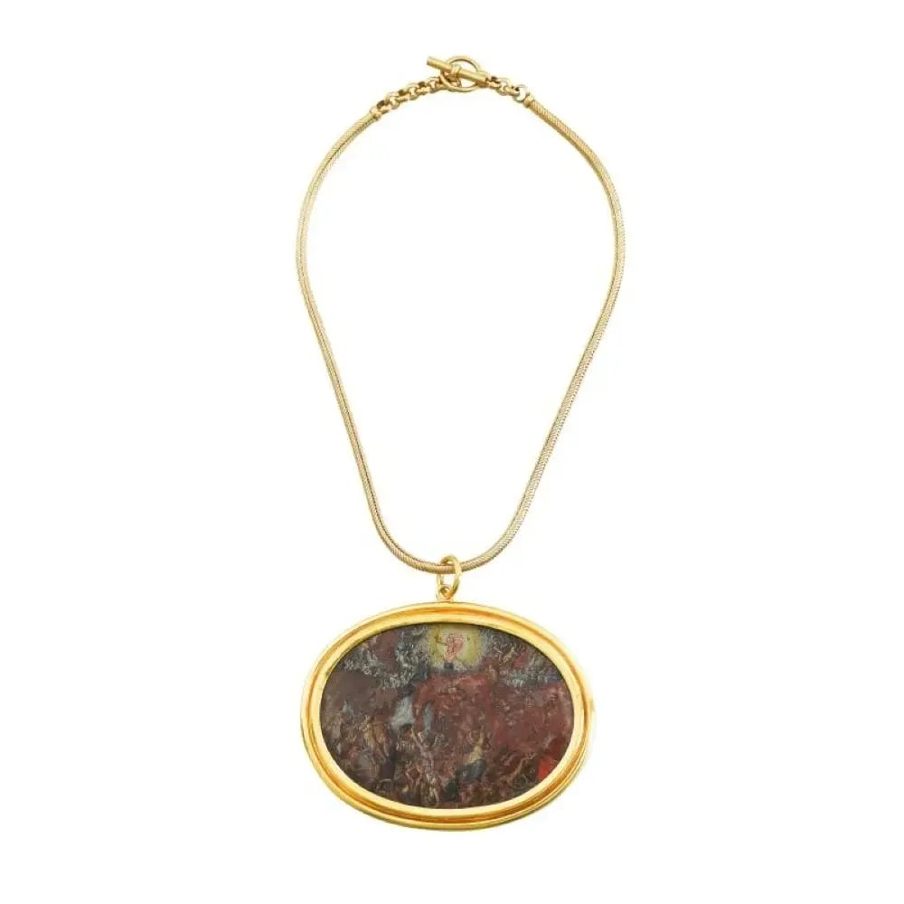 يضم المزاد أيضاً قلادة إيطالية فريدة من نوعها، تتوسطها لوحة تجسد تصوراً ليوم القيامة، نُفّذت على حجر عقيق بيضاوي في أوائل القرن السابع عشر، ويبلغ سعرها 26,165 دولار أمريكي. تُمثل هذه القطعة مزيجاً رائعاً بين الفن والمجوهرات، وتتميز بعمق ألوانها، فضلاً عن كونها مُثبتة على قاعدة من الفضة المطلية بالذهب، ومُعلقة بسلسلة مُطابقة.